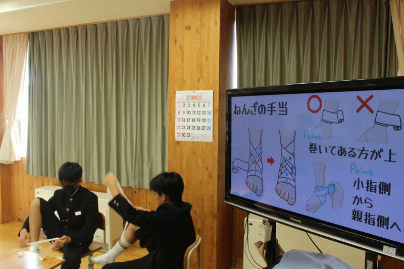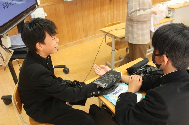 今日は、応急手当の意義と方法を学んだ後に、養護教諭の先生を招いて直接圧迫止血法や包帯法の実習を行いました。慣れない動きに苦労する様子も見られましたが、いざという時に活用できる知識技能を身につけることができました。