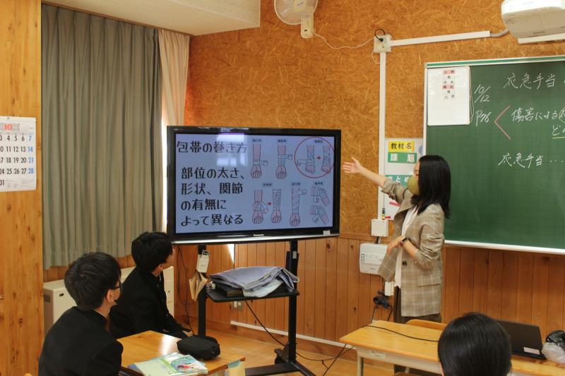 二年生の保健の授業では、応急手当と心肺蘇生法の学習を行っています。