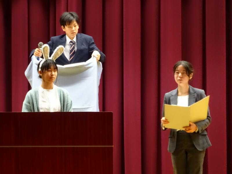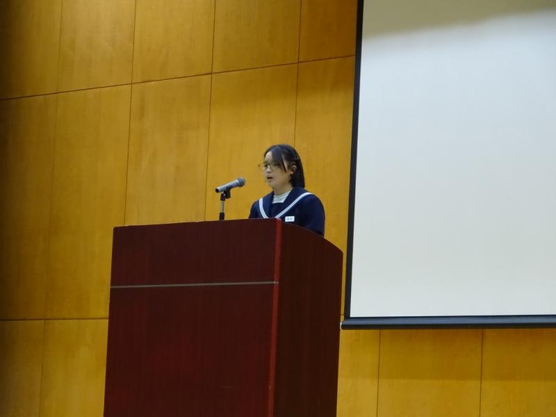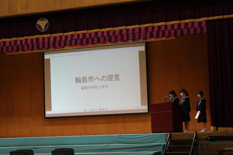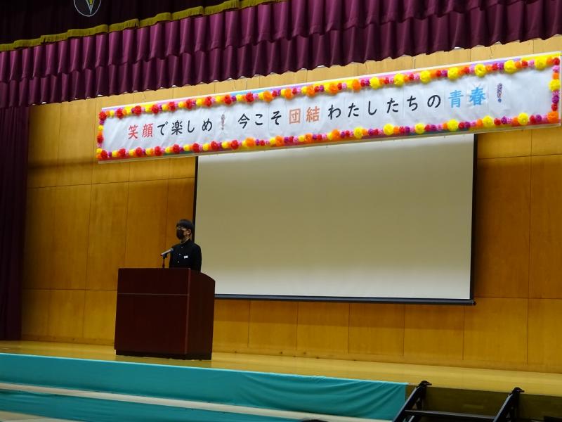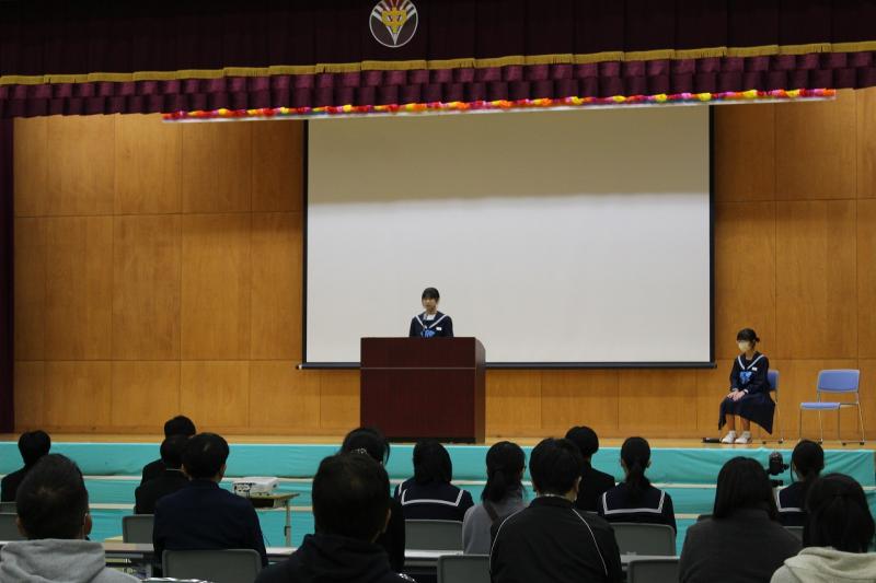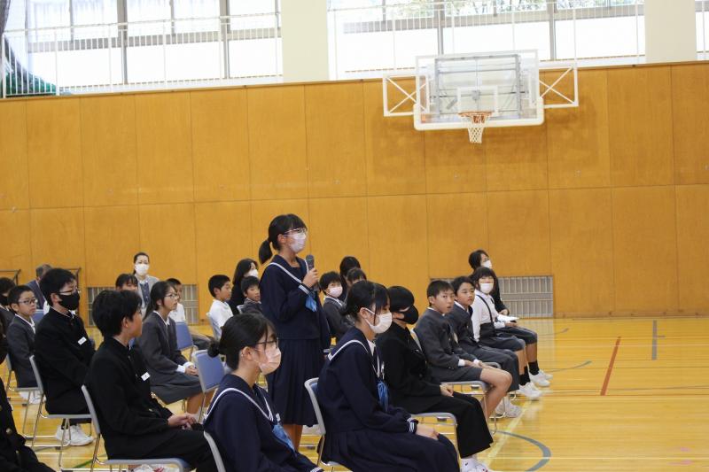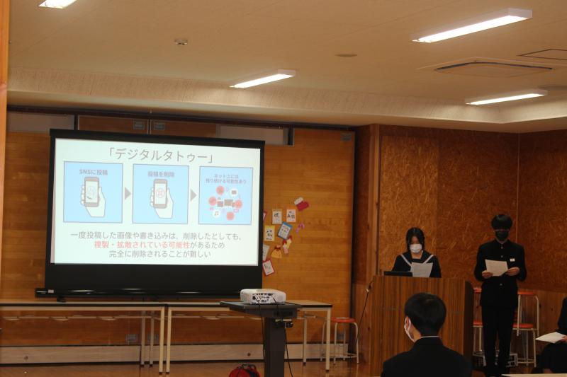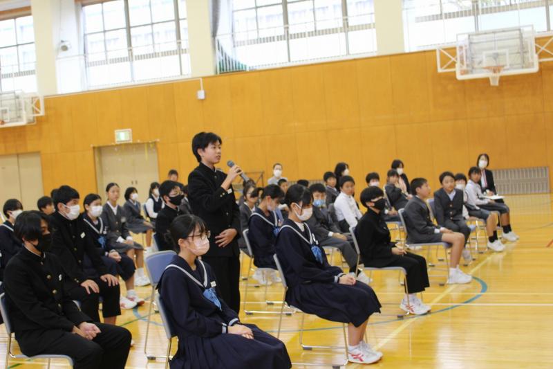 続いて、後期生徒会第1回生徒集会が行われ、各委員会からの活動報告と、今後の活動計画について発表がありました。最後に、執行部から「人権について考えよう」と題して、SNSやデジタルタトゥーなどを題材にプレゼンがあり、生徒同士で意見交換を行いました。