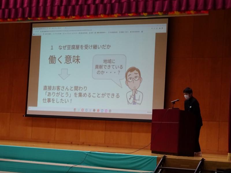 「地域活性化:地域の人々から学ぼう」の視点で、町野地区にある「谷内豆腐店さん」「松尾栗園さん」「輪島網元とねさん」におじゃまして、インタビューを行いました。また、「千枚田」については、市役所の観光課の方とオンラインでインタビューを行いました。お忙しい中、時間をつくっていただきありがとうございました。8月に実施した「職場体験」と合わせ、文化祭で成果を発表したいと思います。