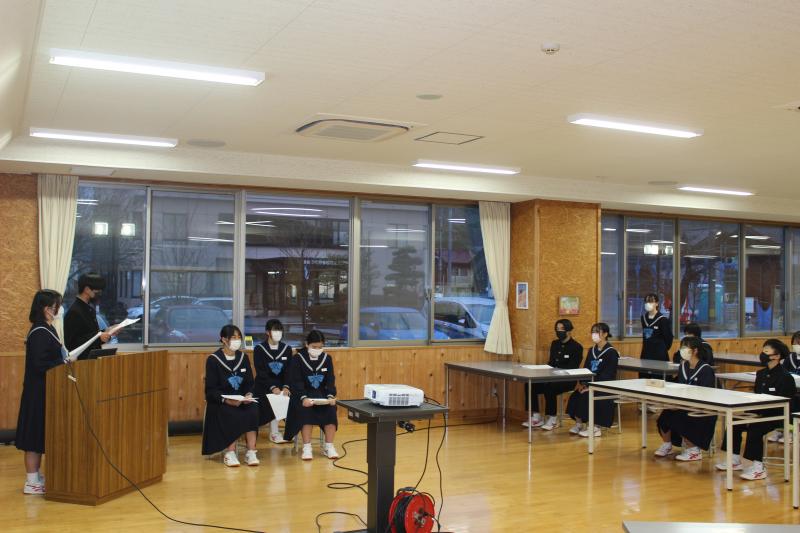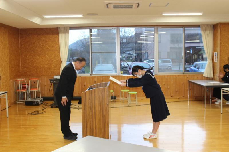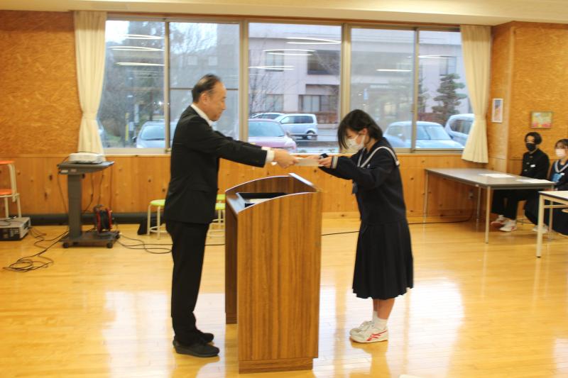英語検定準2級「藤田さん(3年)」、輪島市読書感想文コンクール入選「川原さん(1年)、細谷さん(2年)」及び鴇田くに賞「登岸さん(3年)」、輪島市計算コンクール「満点者9名、合格者7名」に表彰を行いました。
