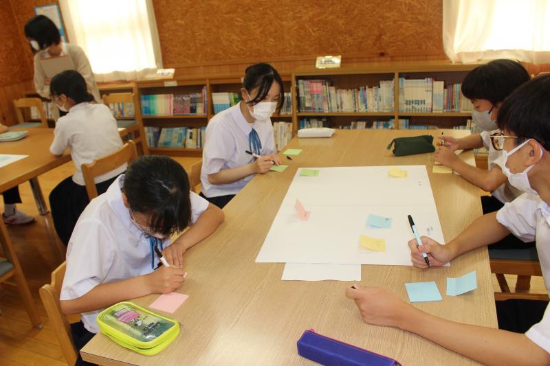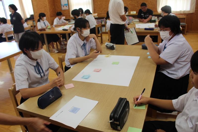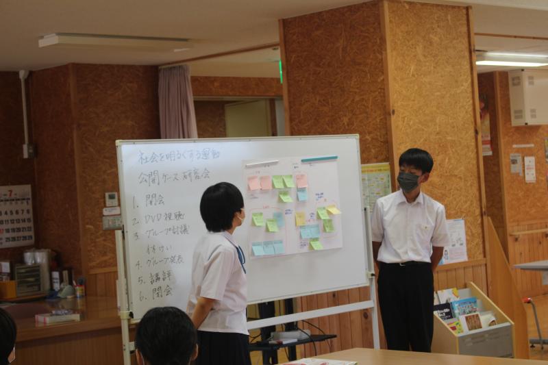 「お互いの立場を認め合い、支え合える社会をめざして」をテーマに、「二つの道」という一人の男のケースについてのDVDを視聴し、「本人」「家族」「友だち」「周囲の人」との関わりや、どんな思いや考えがあったのだろう、どうすればよかったのだろうか等、グループに分かれて意見や考えを出し合い、発表し合いました。