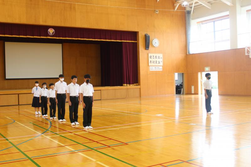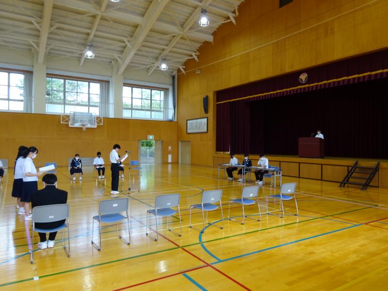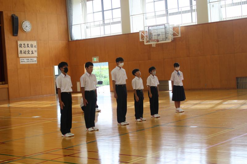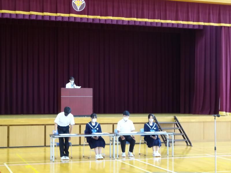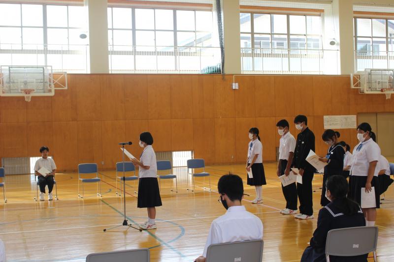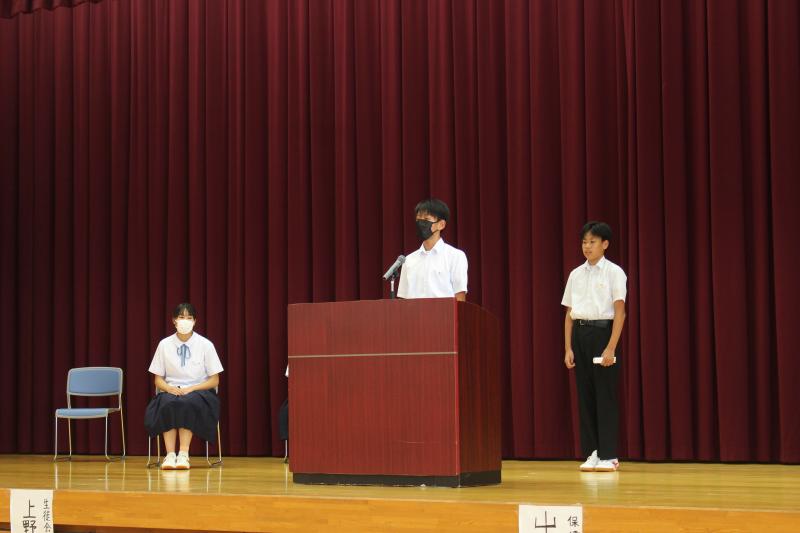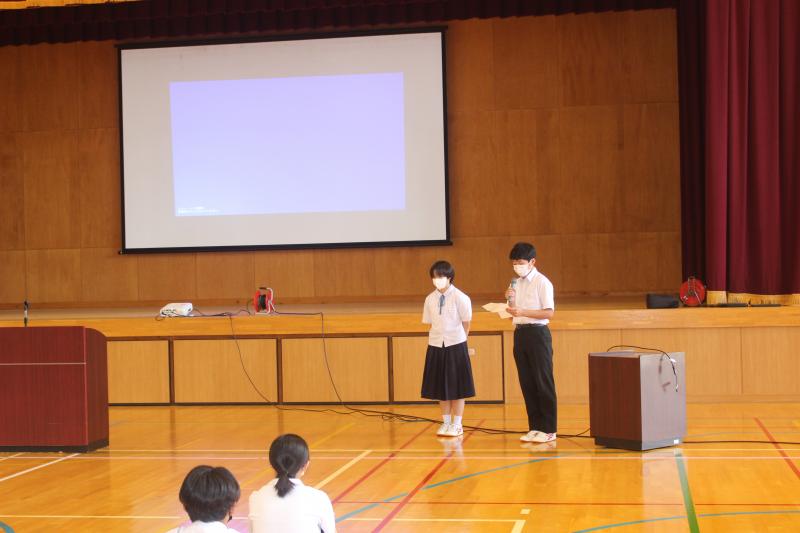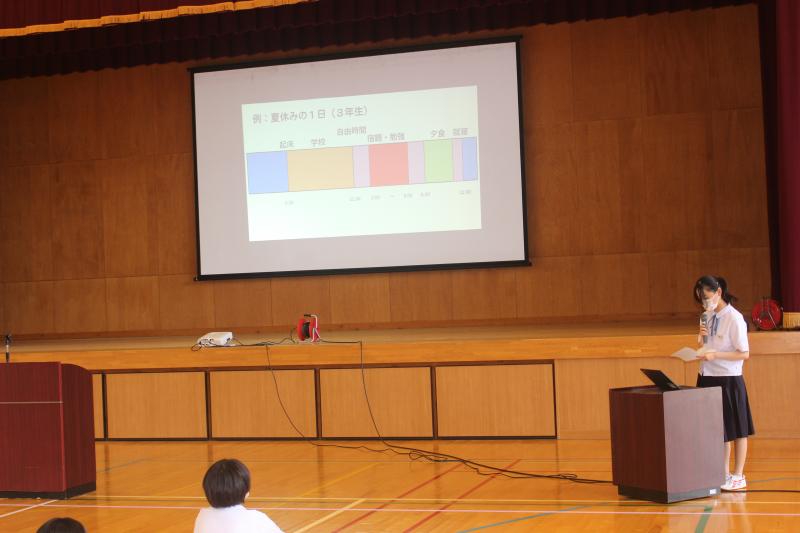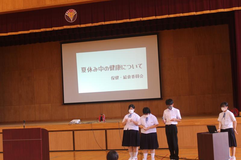 終業式後に、「夏休みの学習について:生徒会執行部」「夏休みの生活心得:図書環境委員会」「夏休みの健康:保健給食員会」が全校生徒に呼びかけました。