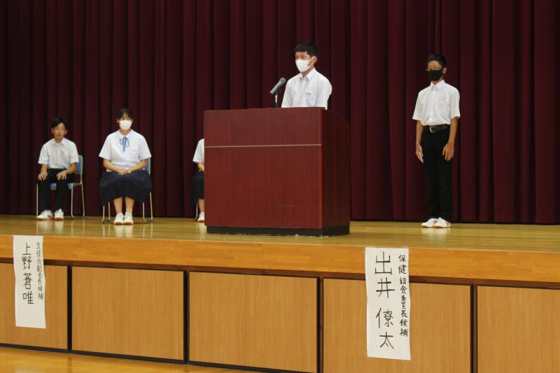 候補者は、「自ら進んで、大きな声で挨拶できる学校にする」「学校行事を全校の力で成功させるために、他学年と交流を活性化する」「後期も健康に学校生活を送るために、感染症の予防に取組みたい」「図書館の利用促進と読書量を向上させたい」など、立会演説会では簡潔にわかりやすく方針を述べました。