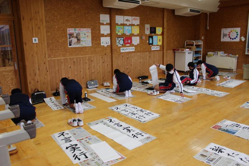 午後からは書初め大会が行われ、1年生「不言実行」2年生「新たな目標」3年生「無限の可能性」を力強く書き上げました。