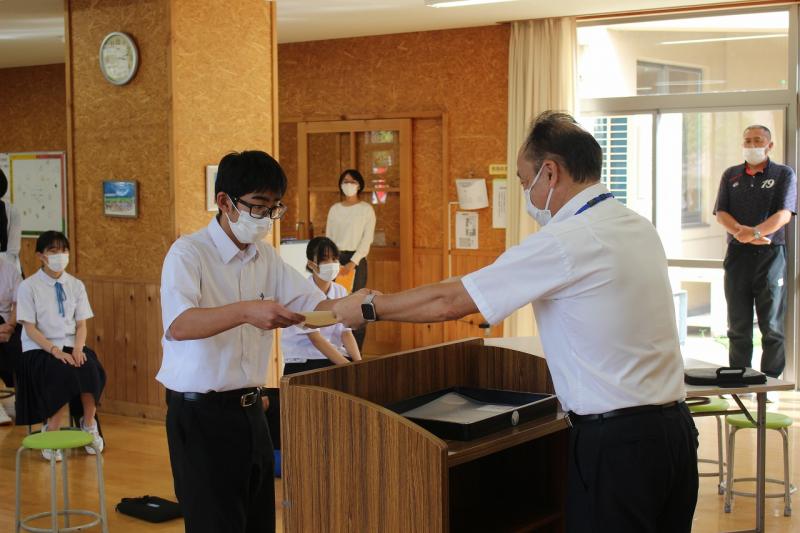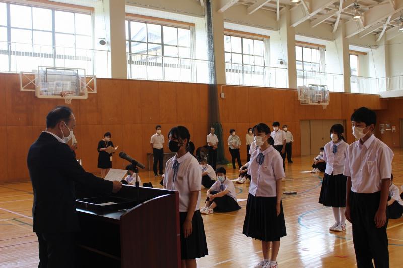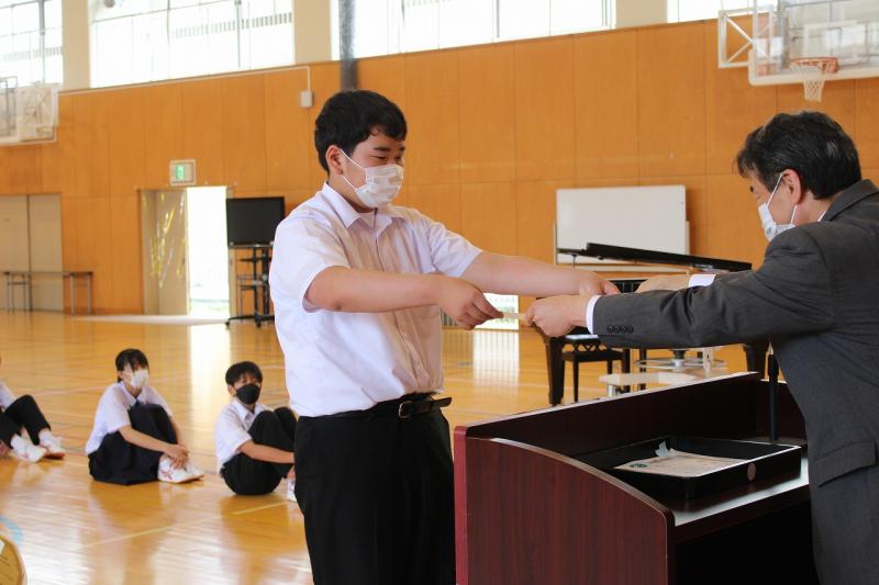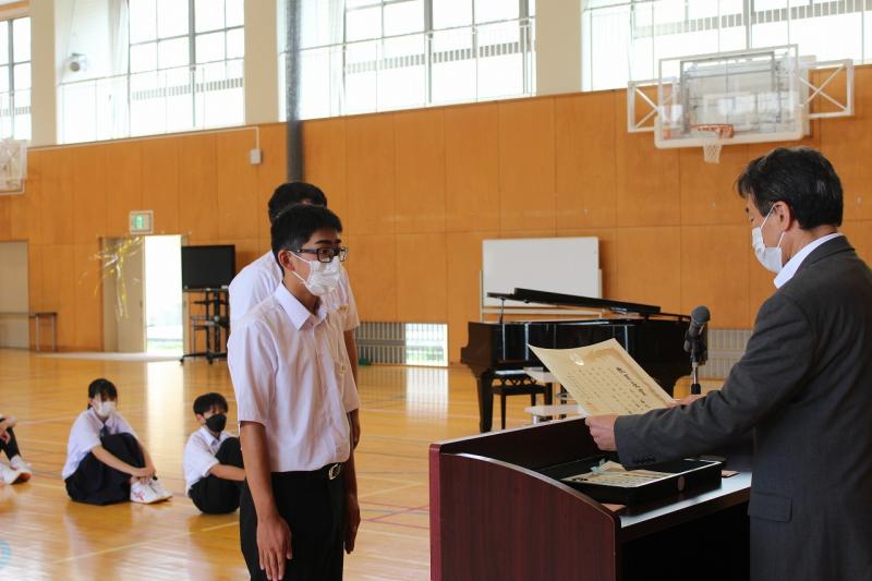 続いて、期末テストの優秀賞及び努力賞の表彰と能登地区水泳大会と輪島市中学生主張発表大会の納賞を行いました。