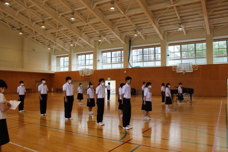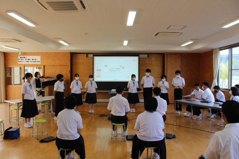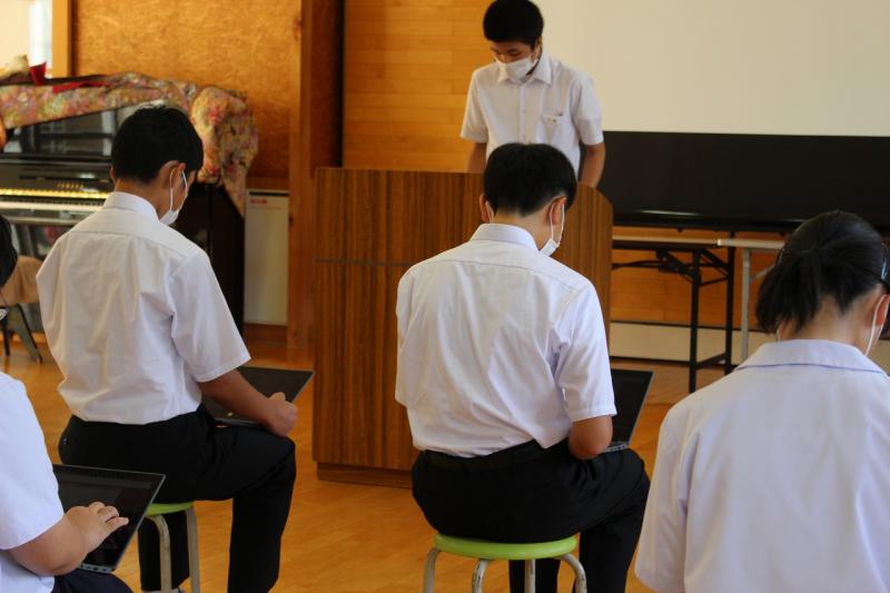 次に、生徒集会が行われ、各専門委員会から7月の活動についての成果と反省、9月の努力目標が報告されました。