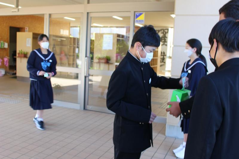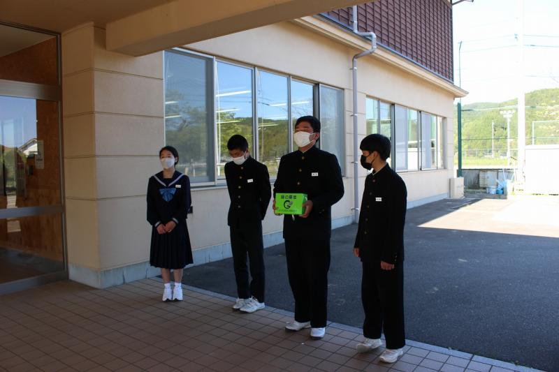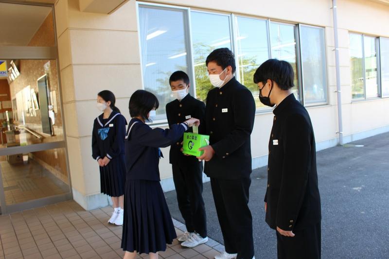 5月10日(火)の登校時、あいさつ運動といっしょに「緑の羽根募金」を行いました。