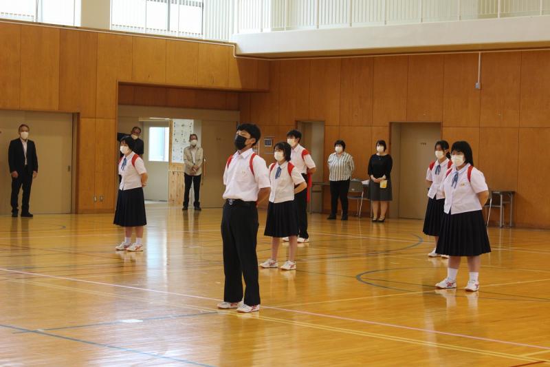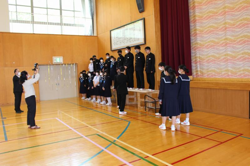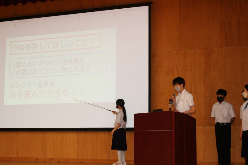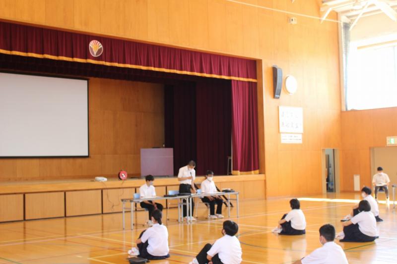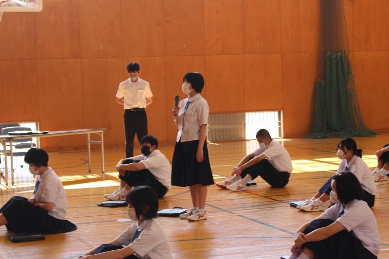 6月2日(木)生徒集会が行われました。執行部、保健・給食委員会、図書・環境委員会の順に、4月,5月の「良かった点・頑張った点」と「課題と改善点」について報告をしました。また、今月の努力目標と活動計画について確認しました。それぞれの委員会が、課題や改善していくことをしっかりと発表することができました。次に3年生男子から、「3年生としての自覚とリーダーシップ」について意見発表がありました。その発表を聞いて、他の3年生からは、「手本になるような3年生になりたい」「下級生をしっかり引っ張っていきたい」「より良い学校にしていきたい」、2年生からは、「3年生になったら、学校を引っ張っていけるような力を付けていきたい」と、前向きな意見が発表されました。一人一人が自己の責任を果たし、力を合わせて学校を盛り上げていってくれると感じられる集会となりました。