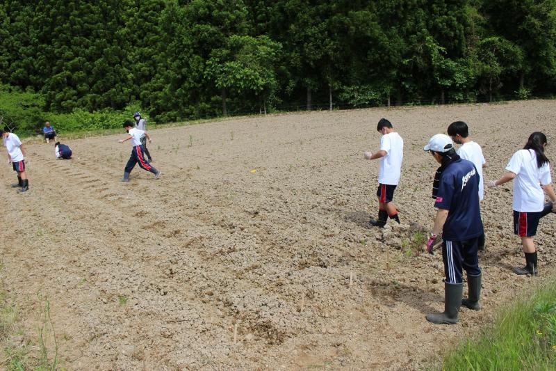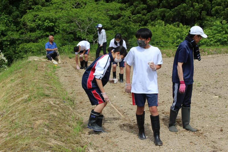 今回は、例年田植えでお世話になっている町野地区在住の方に指導をしていただき、青豆と白豆を約一時間にわたって植えました。