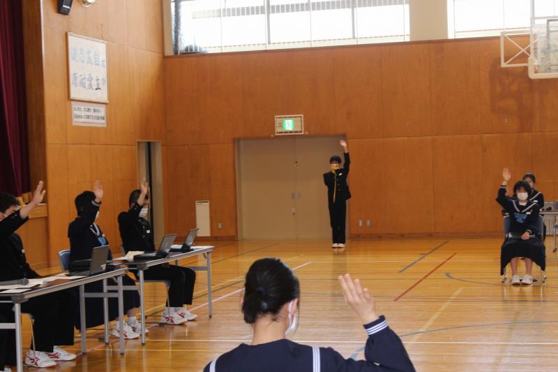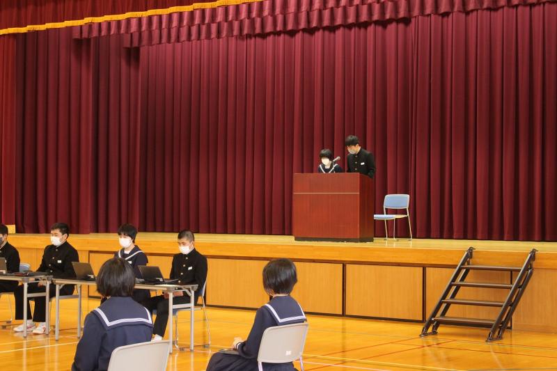 4月21日(木)に生徒総会が行われました。今年度は「挑戦から一歩前へ進もう」という執行部の思いから、スローガンは「躍進」となりました。生徒会執行部と専門委員長からの提案に対して、活発な質疑応答がなされました。自分たちで決めた活動計画を実行していけるように、一人一人が責任をもって取り組んでほしいと思います。学校の主役は生徒のみなさんです。大躍進を期待します。