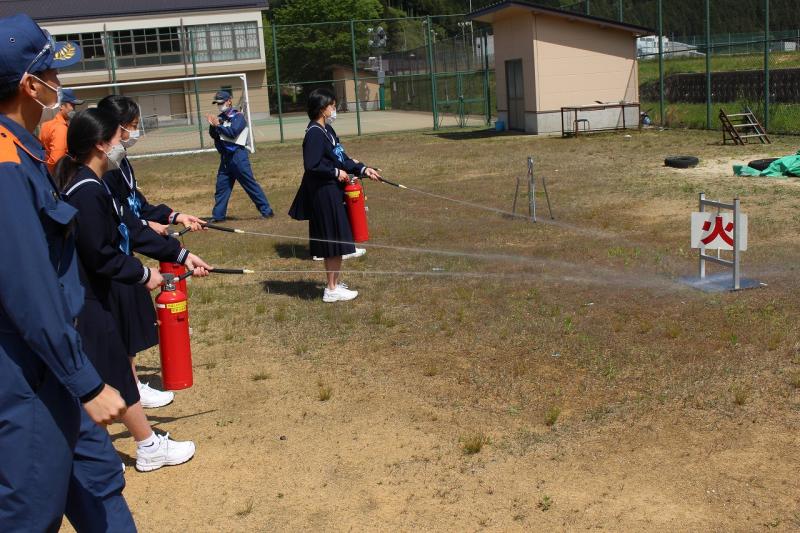 避難訓練のあとは、グランドで消火訓練も行いました。