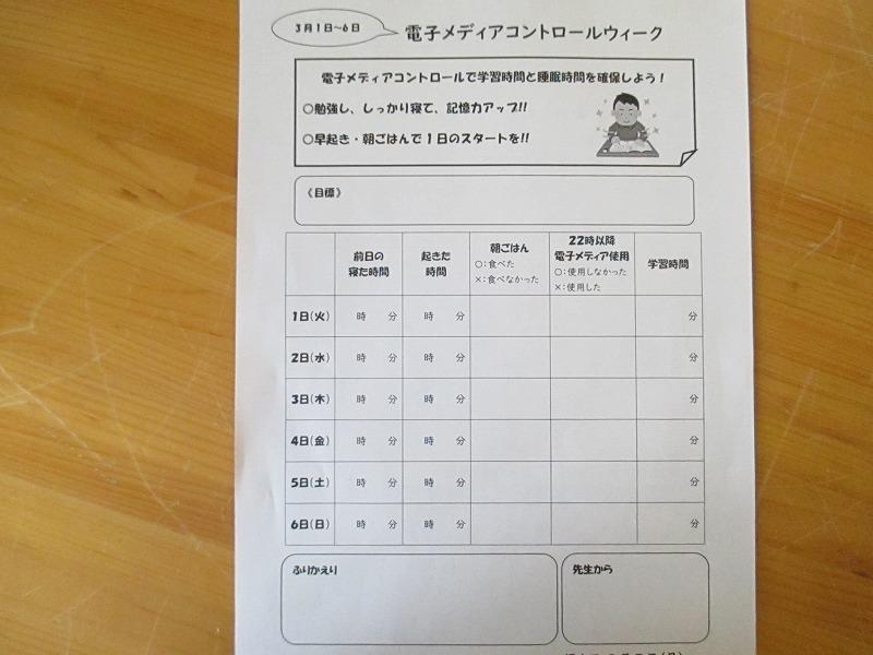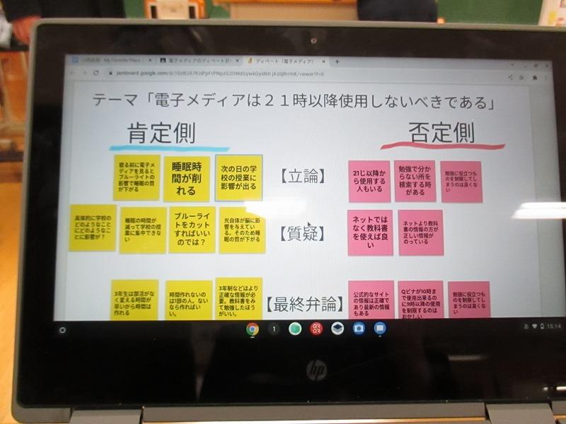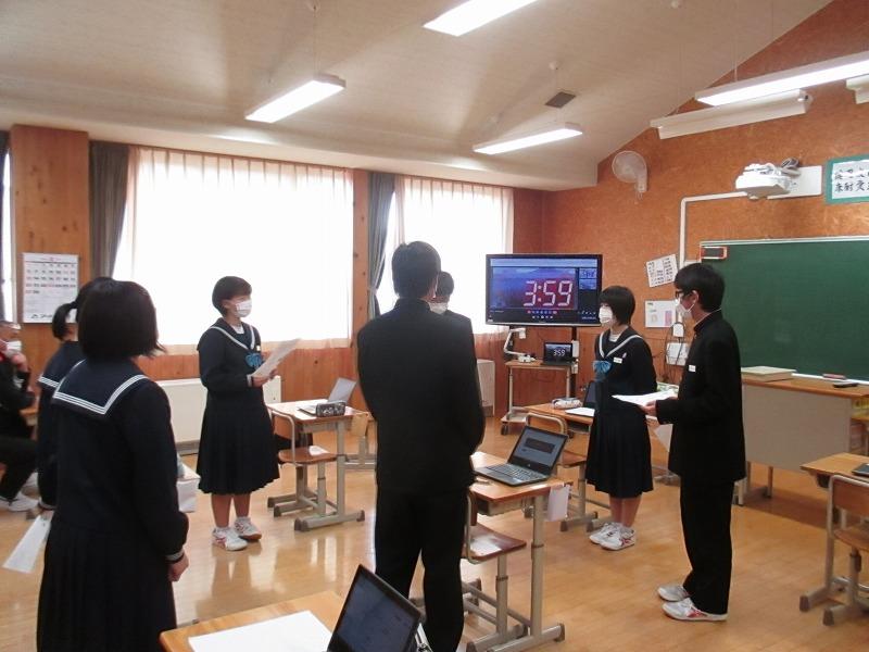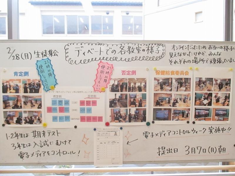 3月1日(火)~6日(日)を「電子メディアコントロールウィーク」として設定し、「学習時間と睡眠時間を確保する」目的で生徒集会を行いました。ディベートのテーマは「電子メディアは21時以降使用しないべきである」でした。肯定側、否定側とも考えを筋道立てて、堂々と主張できていました。保健・給食委員会のみなさん、すばらしい企画ありがとうございました。