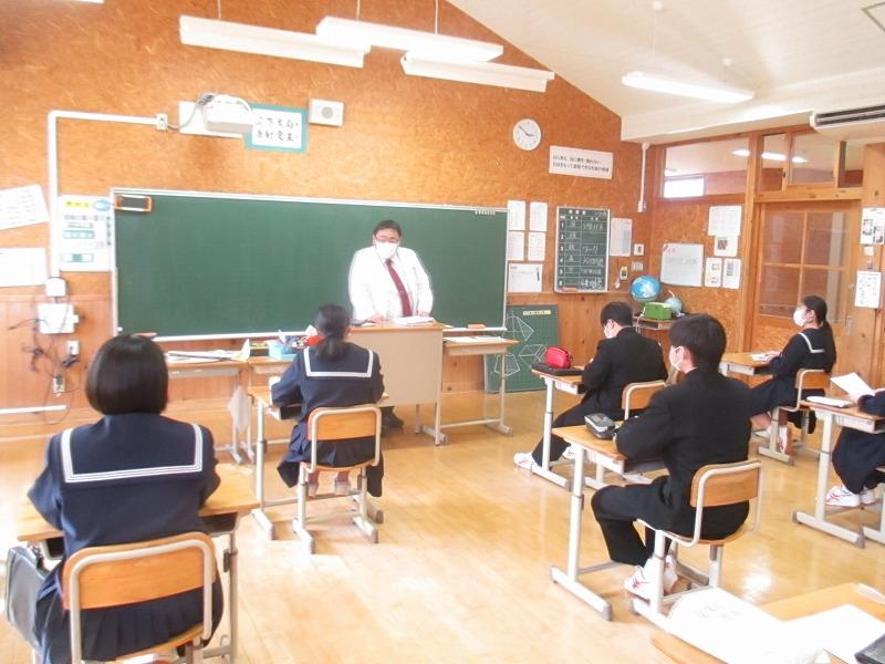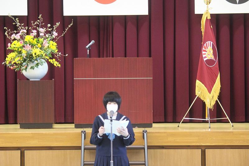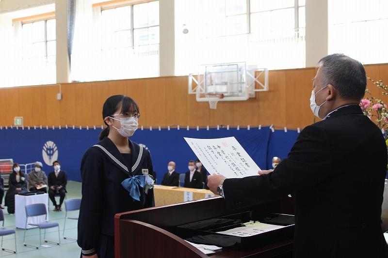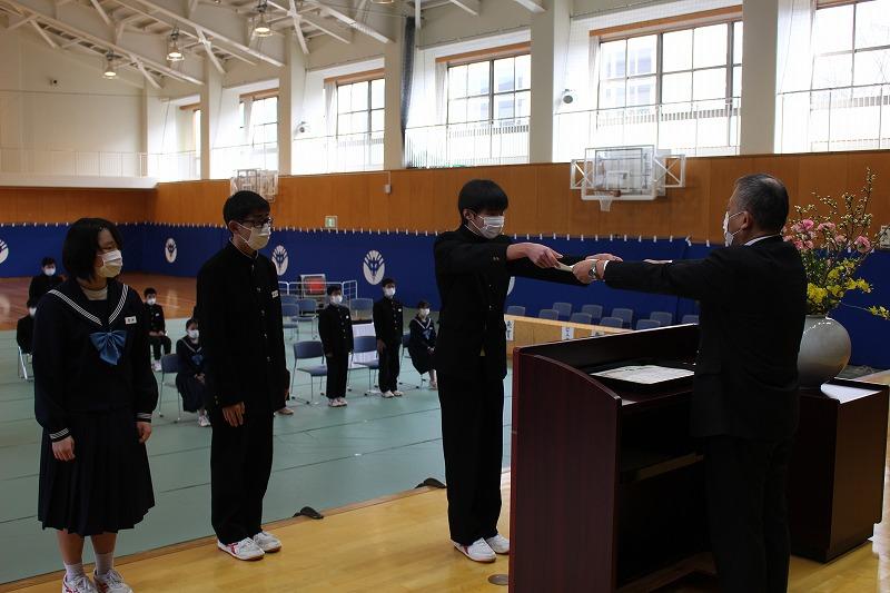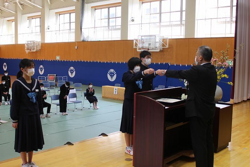 英語検定準2級を合格した生徒へ輪島市教育長賞を贈る表彰式が行われました。準2級に合格した3年生高野さん,2年生森谷さんおめでとうございます。他に,校内書き初め,市内スペリングコンテスト,市内子ども作品展,親子の約束標語コンクール,3学期期末テストの表彰を行いました。