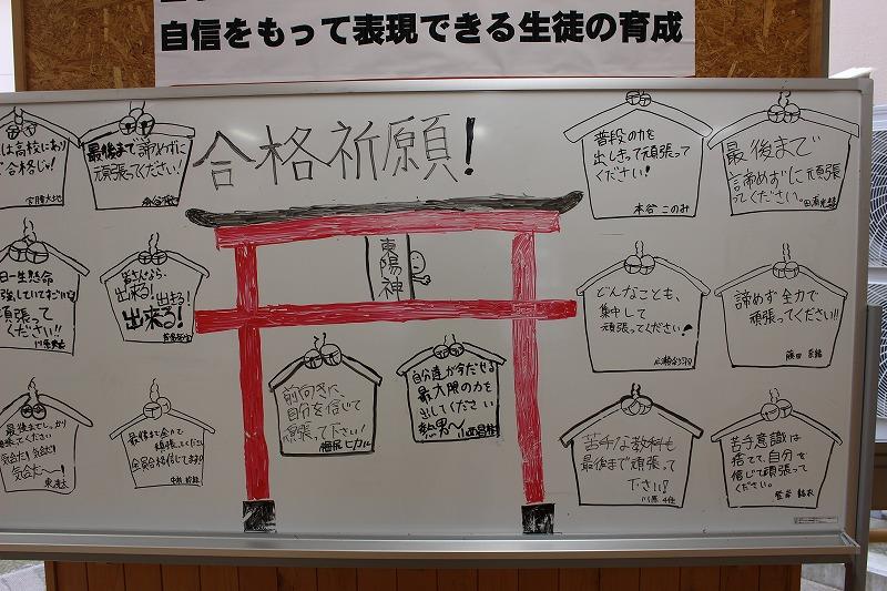 いよいよ明日,明後日(3月8日,9日)公立高等学校学力調査が行われます。3年担任から入試直前指導を真剣に受けていました。1,2年生からは合格祈願メッセージを玄関前に掲示しました。平常心でベストを尽くしてきてください。全員合格を心から祈っています。