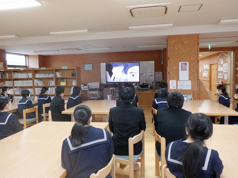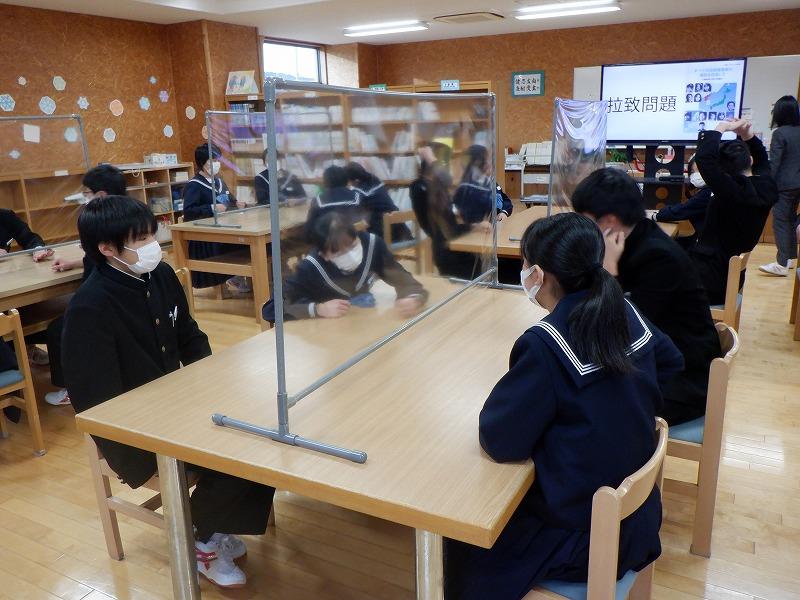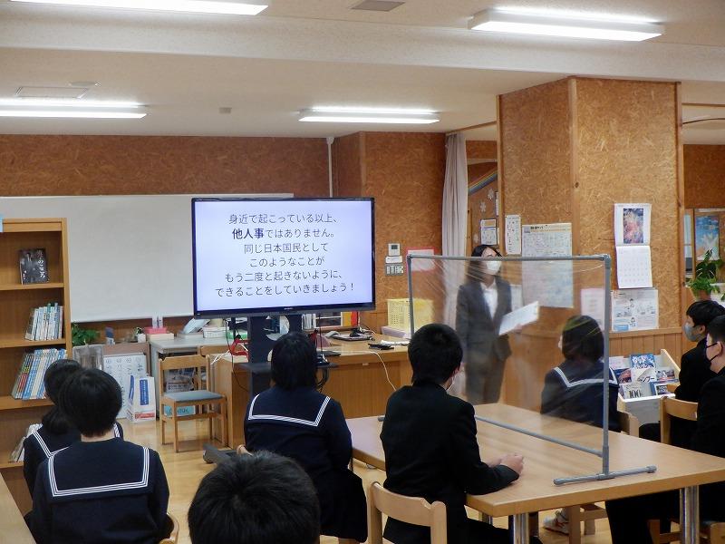 本日は、人権について学ぶということで、拉致問題について考えました。アニメ「めぐみ」を見て、拉致問題という人権問題が身近で起きていたこと、そして現在もまだ解決していないことを知り、生徒は衝撃を受けていました。拉致問題を風化させないことが私たちが今できることであると生徒たちは考えていました。