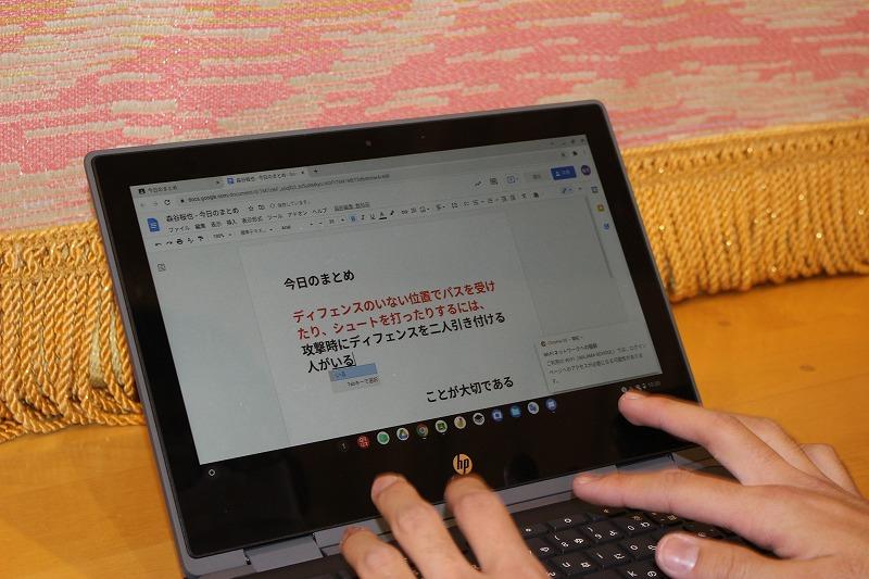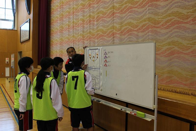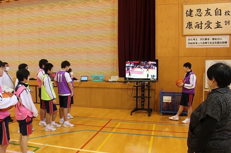 「ゴール方向にディフェンスがいない位置で、パスを受けたりシュートを打ったりしよう」という課題で校内研究授業を行いました。端末で録画動画を繰り返し見たり、ホワイトボードと磁石で動きを考えたりしてスペースを作り出すための動きについて考えていました。理論がわかっても実践に結びつける難しさを感じました。