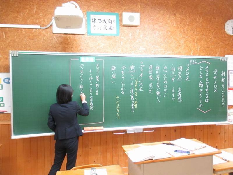 教職員が生徒役となり、模擬授業を行いました。「走れメロス」の教材で「メロスとディオニス王はどんな人物か」という課題を基に、本文の言動を根拠に人物像に迫る内容でした。「いかにして深めていくか」「クロムブックの活用の仕方」の課題がありました。