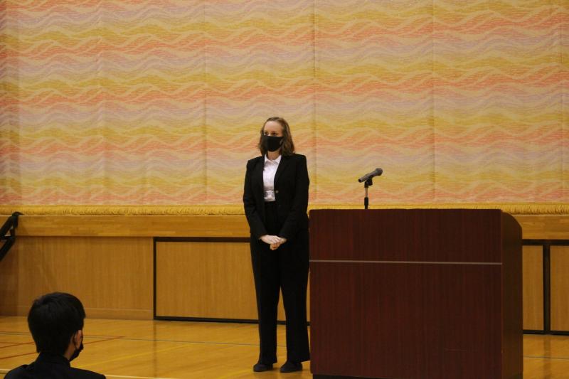 本日より、新しいALTのEmmaさんが毎週金曜に来てくださることになりました。アメリカのオハイオ州出身です。よろしくお願いします。その後、2学期中間テスト優秀賞と努力賞の表彰式を行いました。