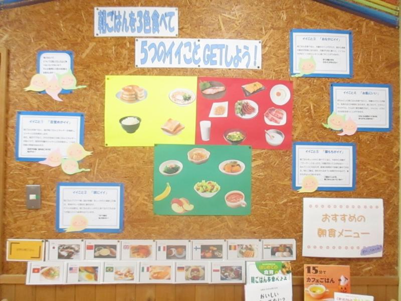 11月の保健室コーナーでは「朝ごはんを3色食べて5つのイイことをGETしよう」と題して、朝ごはんの大切さを紹介しています。(①目覚めがイイ ②頭にイイ ③おなかにイイ ④お肌にイイ ⑤腹もちがイイ)図書室コーナーでは、秋に模様替えです。