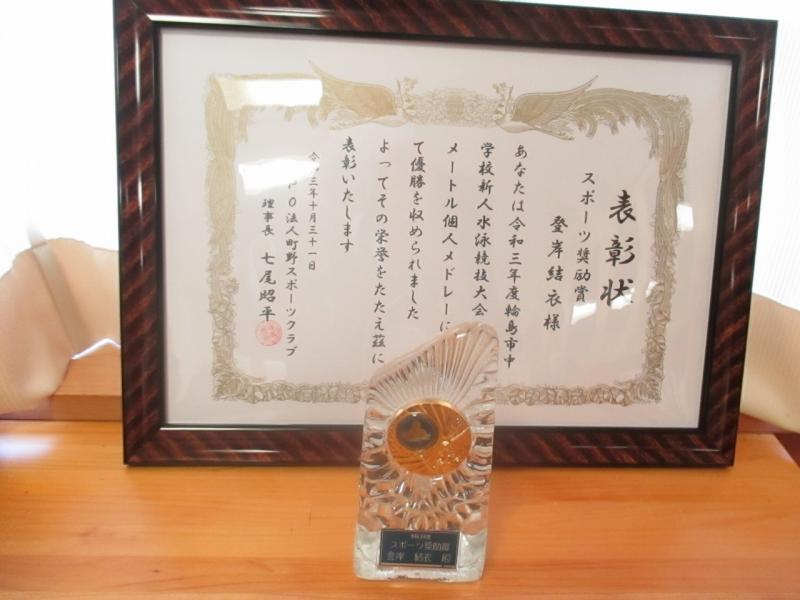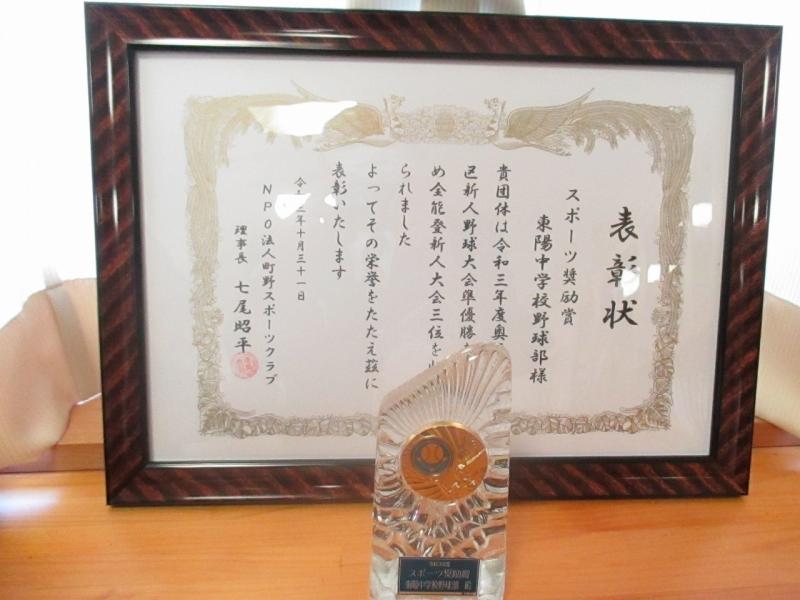 NPO法人町野スポーツクラブ様より、野球部(奥能登新人大会2位、全能登新人大会3位)と登岸結衣さん(市内新人水泳大会200m個人メドレー優勝)に、スポーツ奨励賞として表彰状と記念品をいただきました。ありがとうございました。