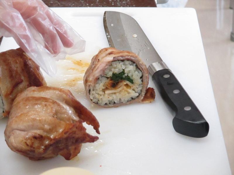 「まいわぁグランプリ」で選ばれた「αのめぐみを使った肉巻きおにぎり」を3年生が実際に作ってみました。文化祭で発表する予定です。
