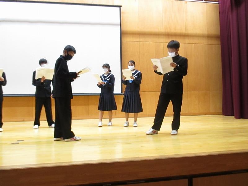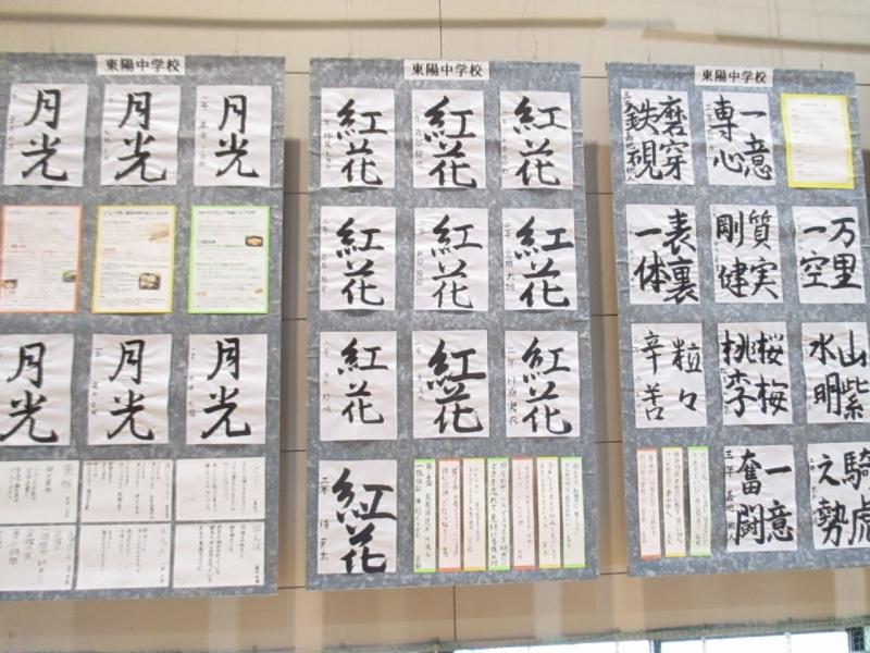 文化祭に向けて本格的な準備が始まりました。全校発表では演劇役者部門、ナレーター部門、書道パフォーマンス部門に分かれて練習しています。スローガンは、「皆でつなぐ 皆の絆 輝け 東陽中!」です。仲間とともに「前向きに」努力し、すばらしい文化祭にしてください。