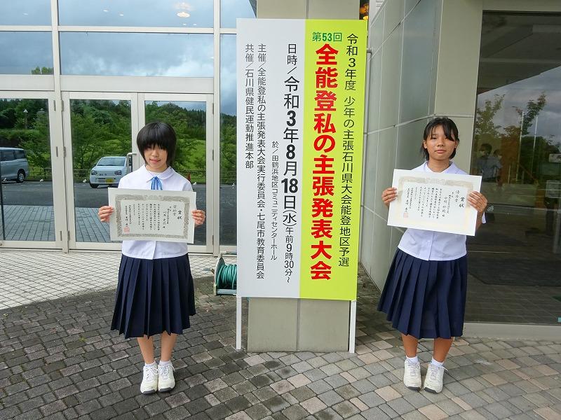 8月18日(水)、田鶴浜地区コミュニティセンターで、全能登私の主張発表大会がありました。本校からは、輪島市を代表して2年、川原さんが「今の社会を改めて考えてみて」、2年、中村さんが「正しい情報が行き渡る世の中に」で出場しました。中村さんは優秀賞を受賞し、県大会に出場します(ビデオ審査)。ほとんどが3年生の中、自信をもって堂々と発表してくれました。