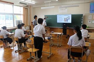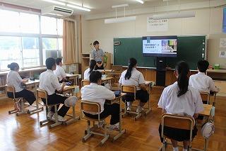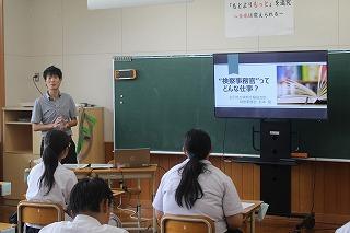 スライドを使いながら「検察庁、検察官はどのような仕事を行うのか」「検察官になるためには何が大切なのか」ということを詳しく教えていただきました。また、「諦めるのは簡単。続けることが重要。困難な壁に当たったとしても、諦めずに努力し続けてほしい。」と、後輩へのメッセージ、将来就きたい職を志す上で大切な姿勢についてのアドバイスもありました。生徒達は、これまで馴染みのなかった「検察庁」「検察官」「検察事務官」という仕事について、真剣に耳を傾けていました。