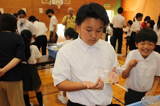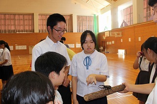 生徒は最初、緊張している様子でしたが、金色に輝くオオゴマダラの蛹やゴボウの香りを放つタイワントビナナフシなど、初めて目にする昆虫に興味津々でした。また、生きたヘラクレスオオカブトに触れる機会もあり、日本のカブトムシをはるかに上回るその大きさに、目を輝かせていました。