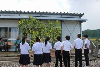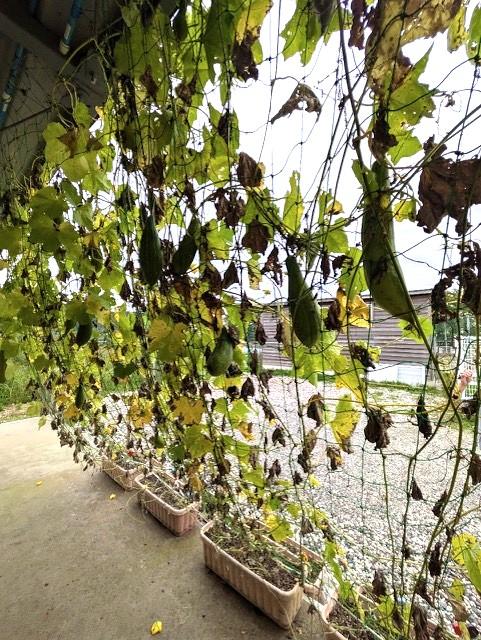 仮設住宅の集会所に設置した「感謝のグリーンカーテン」。8月に、ヘチマの実が1つ実ったことをお知らせしました。10月になって、様子を見に行くと…。