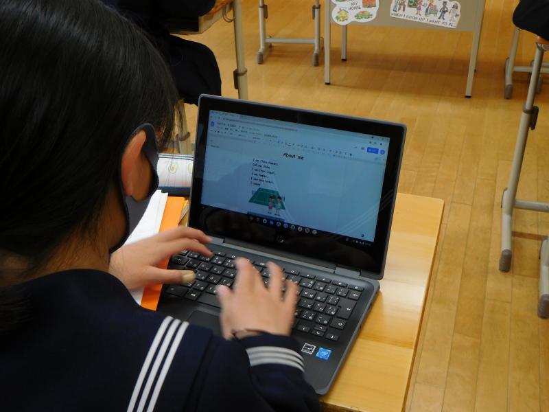 1年生英語で、絵を挿入して自己紹介文をつくり、プレゼンする授業を