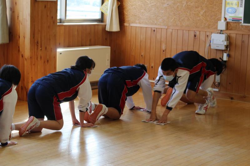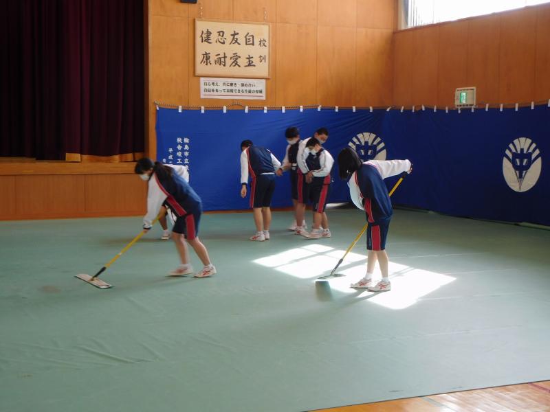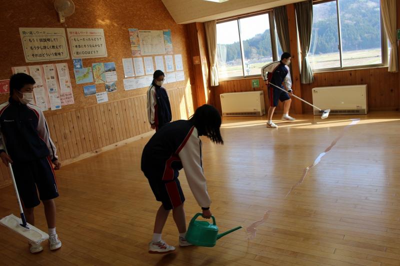 まず、水拭きをして床の汚れ落とし、保健・美化委員の生徒がワックスがけをしてくれました。