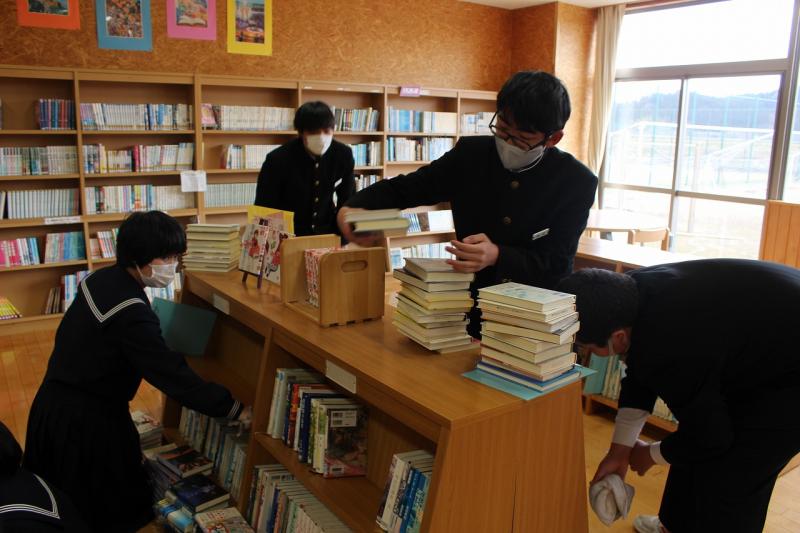 2021年3月3日 17時36分今日の昼休みに、図書・掲示委員会の生徒たちが図書室の掃除をしてくれました。
