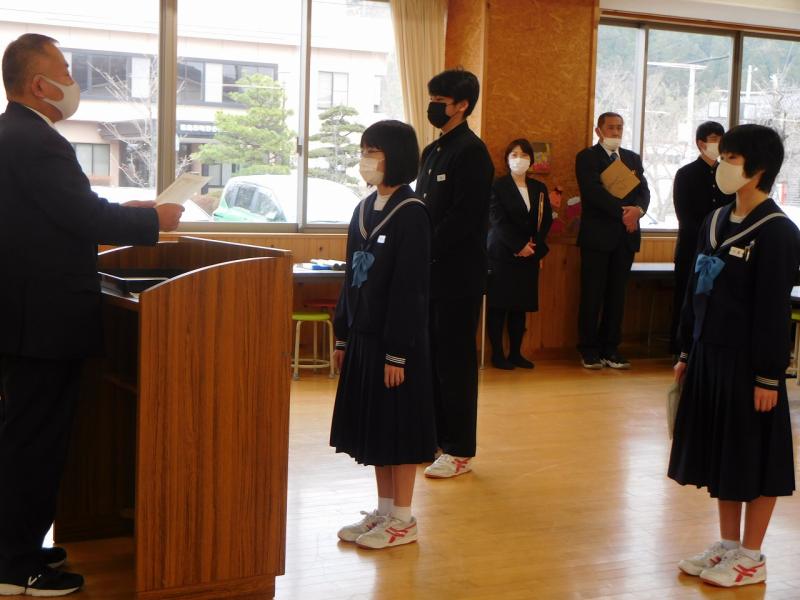 作品入賞の納賞式、期末テスト優秀賞・努力賞(なんと前回より15人増)の表彰式、終業式を行いました。
