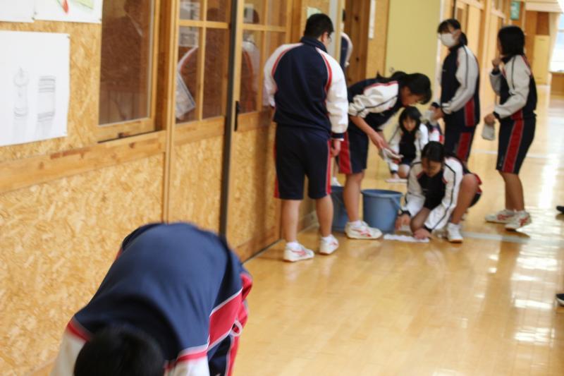 放課後、生徒・職員みんなで校舎の汚れ落とし、ワックスがけを行いました。
