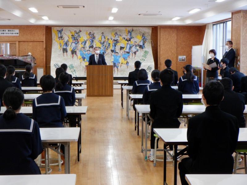 本校のPTA会長、南忠博様より3年生に向けて合格餅をいただきました。