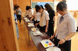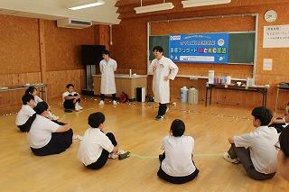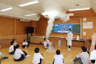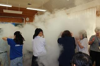 普段の理科の授業では体験できないような大規模な実験に、生徒はとても興味津々でした。特に、「教室の中につくった積乱雲の中に入ってみよう!」という実験のときには、最初は不安な様子でしたが、雲の勢いや冷たさに大きな歓声がわきました。また、-196℃の液体窒素に手を一瞬入れても凍らないという不思議な現象にとても驚いていました。この授業をきっかけにして、身の周りの生活にあるたくさんの『理科』に気付くことができるといいですね。
