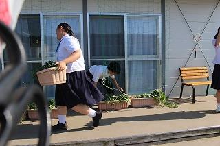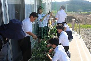 先月、仮設住宅の集会所に全校生徒で設置させていただいたヘチマのプランター。地域の方々にも水やりのご協力をいただきながら、今年はたくさんの花を咲かせました。太陽の光をいっぱい浴びて、「感謝のグリーンカーテン」は生い茂り、黄色い花もたくさん咲いています。