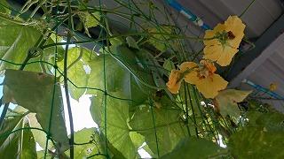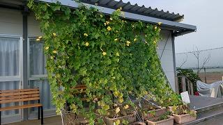 「感謝のグリーンカーテン」は、酷暑の中、心地よい日陰を作ってくれています。大きな実もどんどん実りますように。
