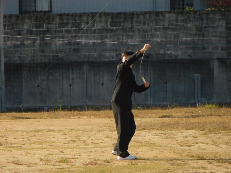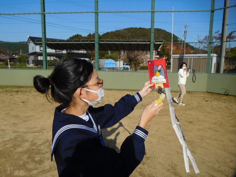 1年美術で十二支の絵を描いた角凧を作成しました。運動場で凧あげに挑戦しました。