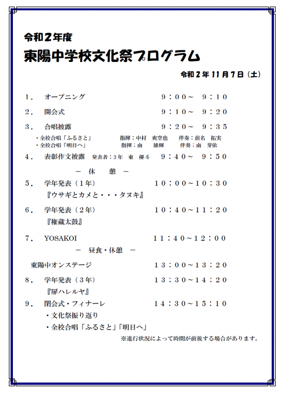 11月7日(土)の文化祭のプログラムをお知らせします。
