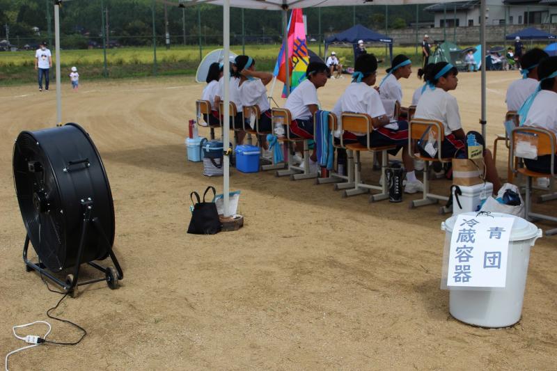 大型扇風機、屋外シャワー、大量の氷を子どもたちのテントに設置しました。