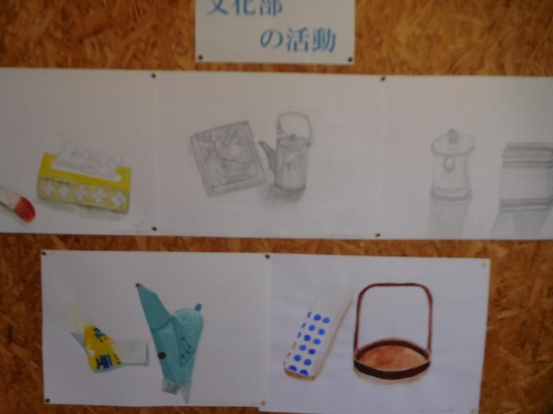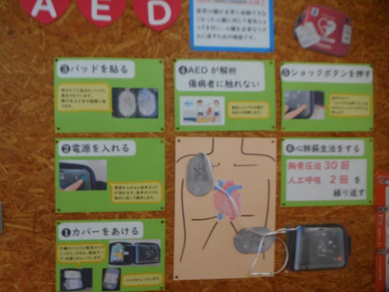 保健室前の今月の掲示(AEDの使い方)、図書室の掲示(私のおススメの本)、文化部の作品掲示を紹介します。