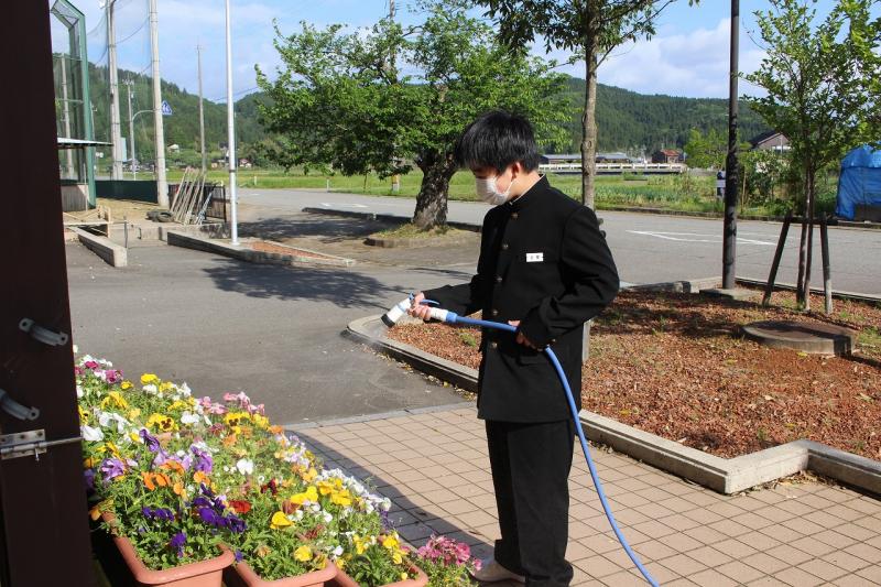 生徒会委員会が始動していない中、進んで玄関前のプランターに水やりをしてくれた生徒がいました。