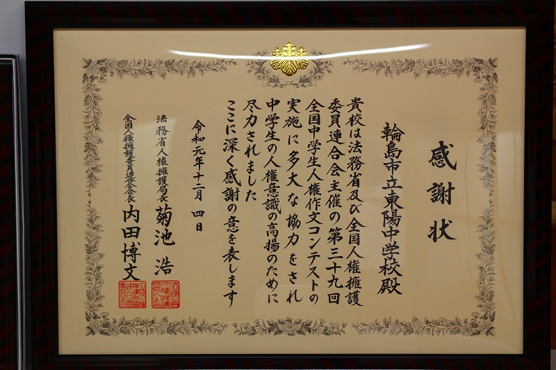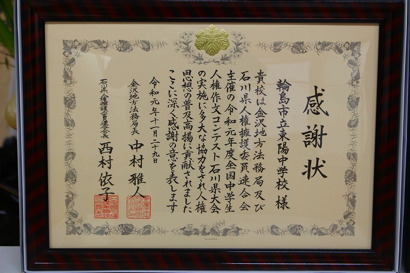 また、東陽中が、法務省人権擁護局と石川県人権擁護委員連合会より、人権
