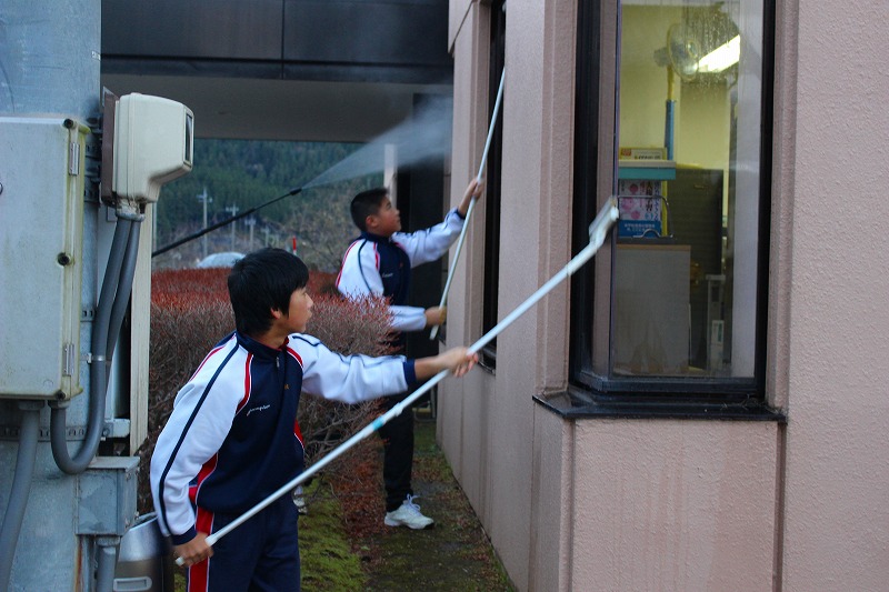 1・2年生の有志で、町野公民館の窓拭き・清掃活動(ISOボランティア)を