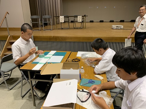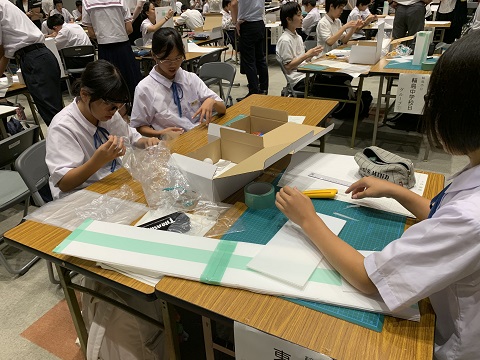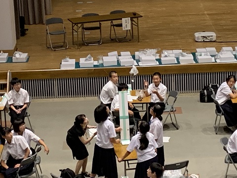 8月1日(木)石川県中学校サイエンスチャレンジ能登地区大会がラピア鹿島で行われ、1,2年生合同で2チーム参加しました。今年度の課題は、パラシュートと発射装置を製作し、床に落下するまでの滞空時間を競いました。発射装置においては、ゴムの力を利用して、より高く安定してパラシュートを飛ばすことがポイントでした。