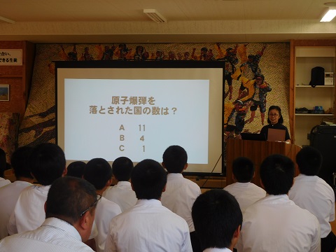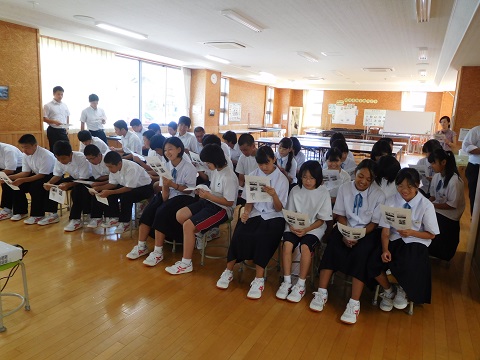 8月2日(金)全校登校日に平和学習を行いました。資料と映像をもとに原爆ドーム、長崎平和記念像、ひめゆりの塔、祈り鶴と少女、知覧特攻隊について学習を深めました。「事実を知って伝えていってほしい」「歴史は繰り返される。だから、歴史から学ぶ」というまとめを行いました。