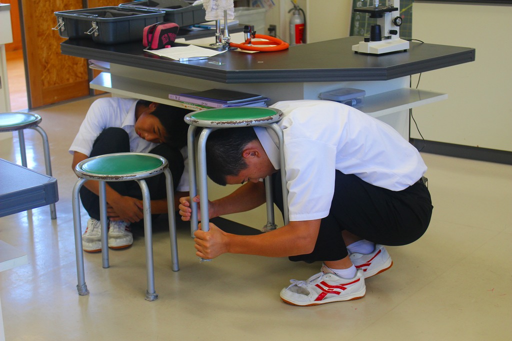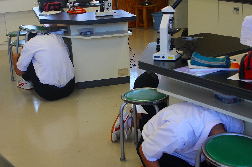 行いました。地震の被害から自分自身を守るための「しゃがむ」「隠れる」